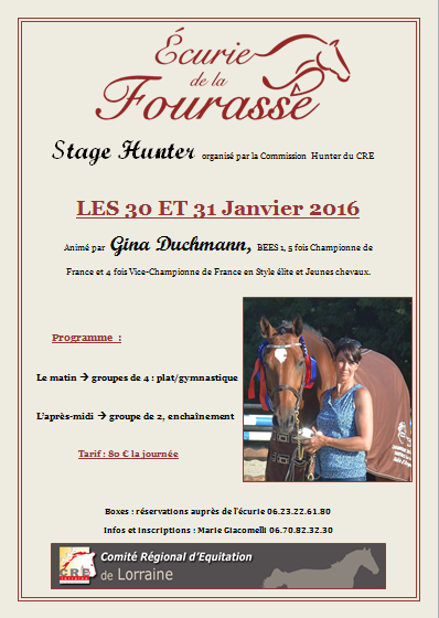 30 au 31 Janvier 2015Stage HUNTER avec Gina Duchmann ce weekend l'Ecurie de la FourasseEcurie la fourasse Moncl-les-LunvilleRetrouvez dans cette affiche toutes les modalités et le programme de ces deux... Lire l'article |